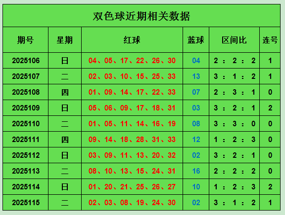 综上所述本期推荐红球区间比1 : 3 : 2。