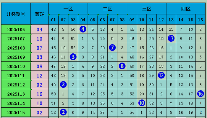 上期蓝球开出号码02,近十期开出蓝球在一区4个,二区2个,三区2个,四区2个,一区走势最热,三区走势较冷,本期预测蓝球出现在四区,重点关注号码:15。