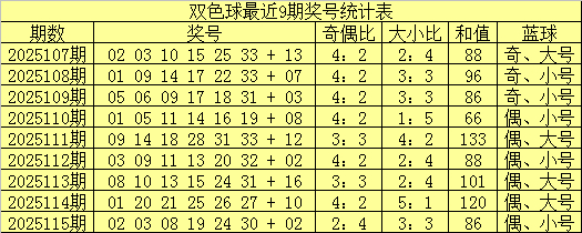 奇偶比:上期红球奇偶比为2:4,其中偶号红球表现活跃,最近9期红球奇偶比为32:22,奇数红球表现较热,本期注意偶数红球转热,看好奇偶比1:5。